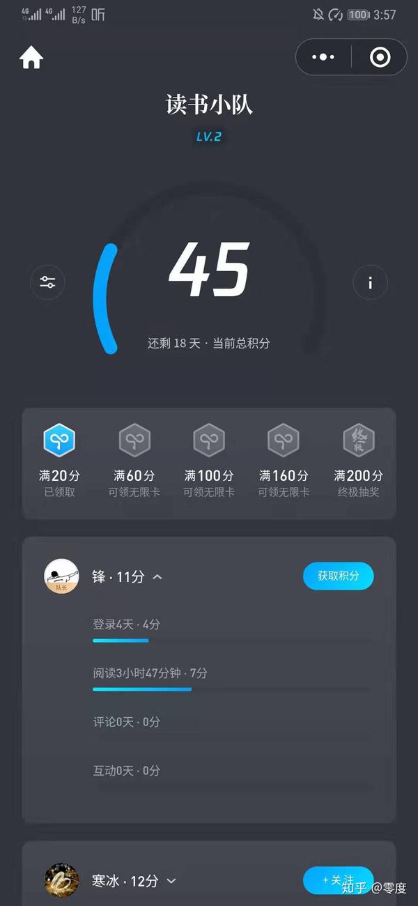 21天为一期,每期每人读书积分最大可达到80分,而事实上每人平均达到34分,就能达到队伍的上限,而队伍成所有人的积分都是累计到队伍的,只要累计到固定值就可领一次无限卡,累计积分越多,拿到的无限卡也越多。